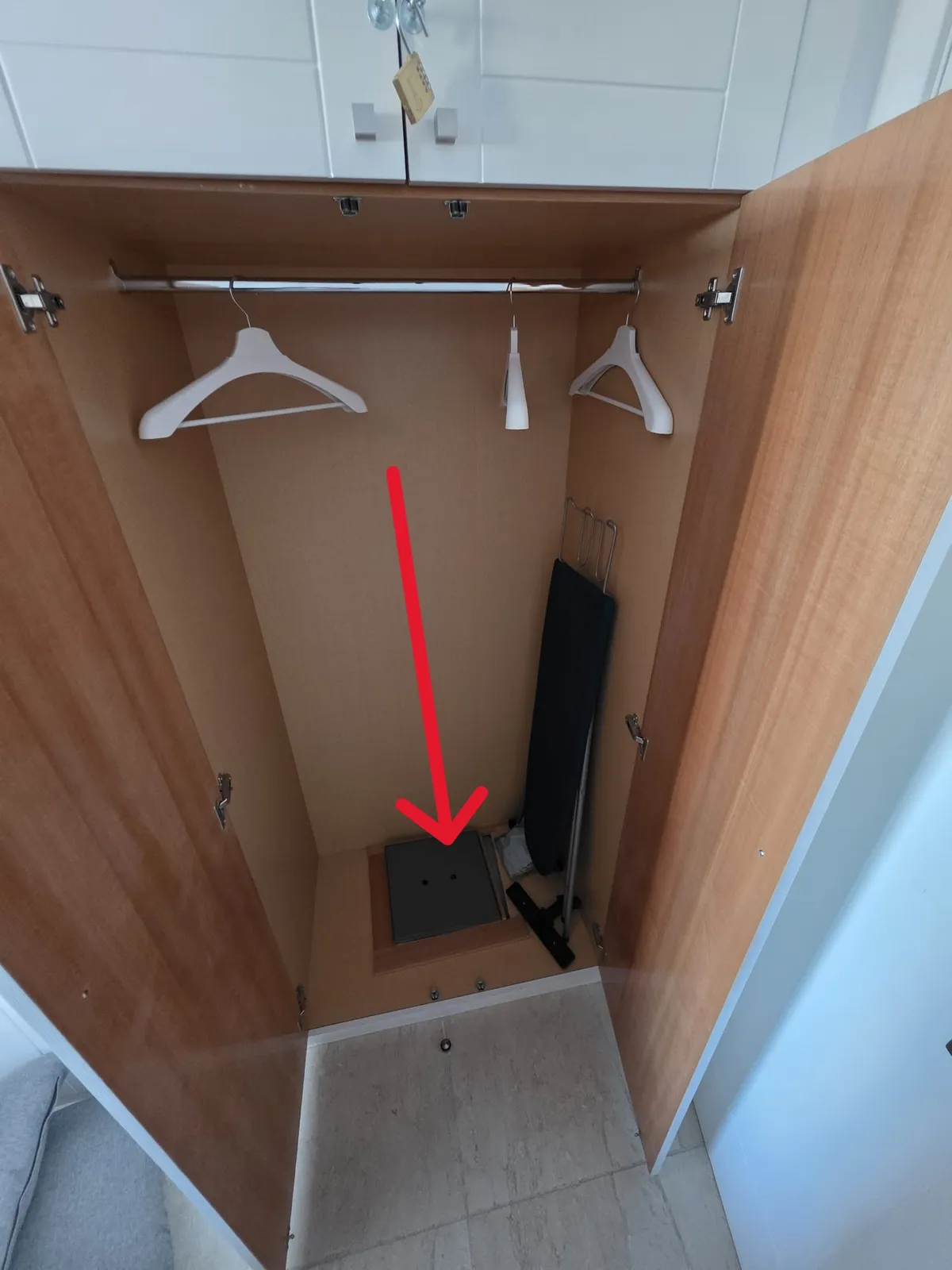 In de bodem van de kast in de gang naar de slaapkamer, bevindt zich een kluis.