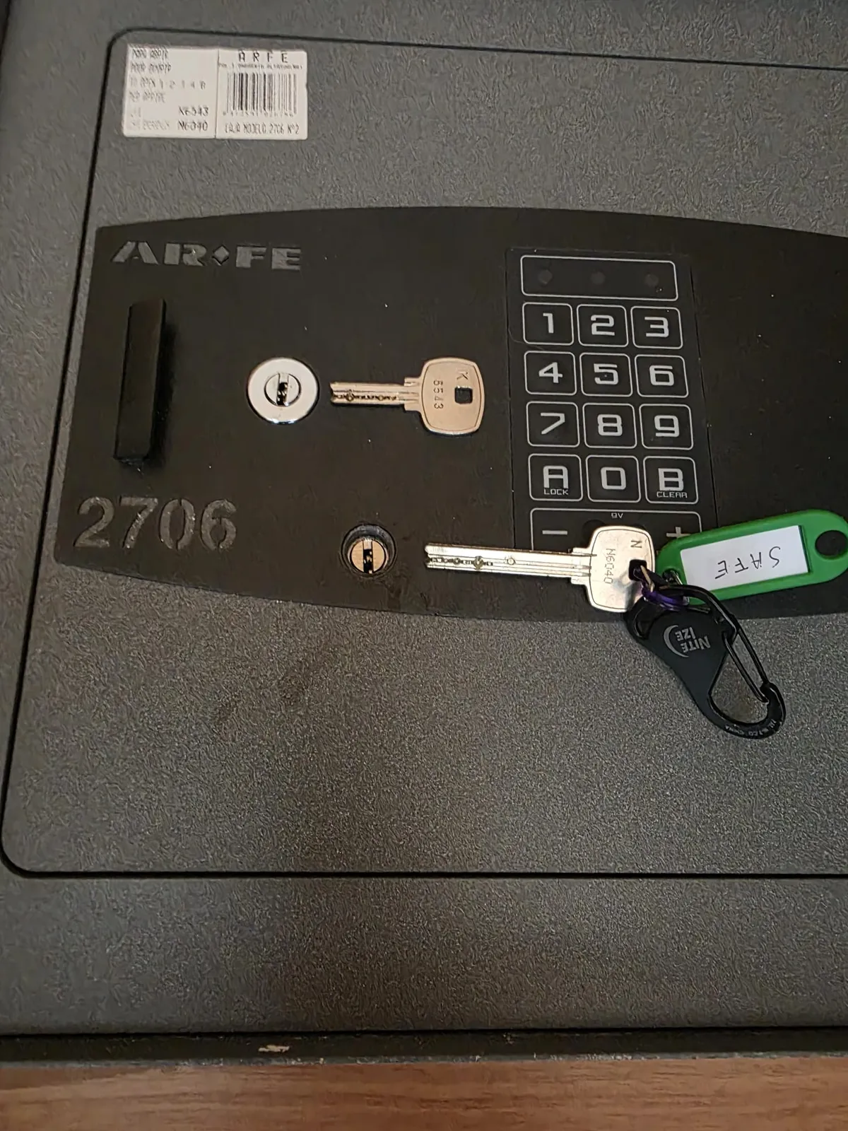 Draai eerst de lange sleutel naar rechts. Daarna draait u de korte sleutel naar rechts om de kluis te ontgrendelen.